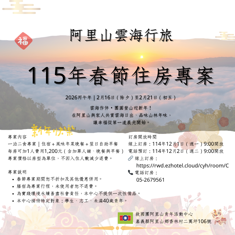 🏮 阿里山雲海行旅(救國團阿里山青年活動中心) 🌸 115年(2026丙午年)春節住房專案 【專案主題】 阿里山春節團圓・雲海年味假期 雲海迎曙光,年味暖團圓—— 與家人共享阿里山的年味時光,一泊二食 […]